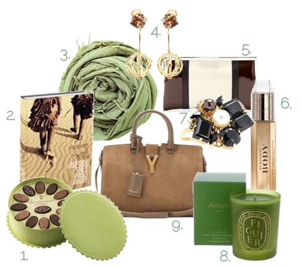 1. Neuhaus Haute Patisserie gift box with 27 sensational chocolates created by nine internationally renowned pastry chefs from around the globe 2. Coffee table book ‘Before they pass away‘. A fascinating photography tribute to vibrant tribal cultures around the world by Jimmy Nelson. A keepsake! 3. Cashmere and silk scarf 4. Marni drop cage clip on earrings in gorgeous walnut brown and gold 5. And another great Marni find; a bicolor frame patent clutch embellished with smooth leather trim and lustrous silvertone hardware 6. Burberry Body Eau de Parfum intense 7. Erdem gold plated Swarovski crystal and pearl embellished ring 8. A candle from the legendary Parisian shop Diptyque packaged in an elegant green gift box 9. Very classy, timeless suede ‘petit cabas tote’ in taupe by Saint Laurent.