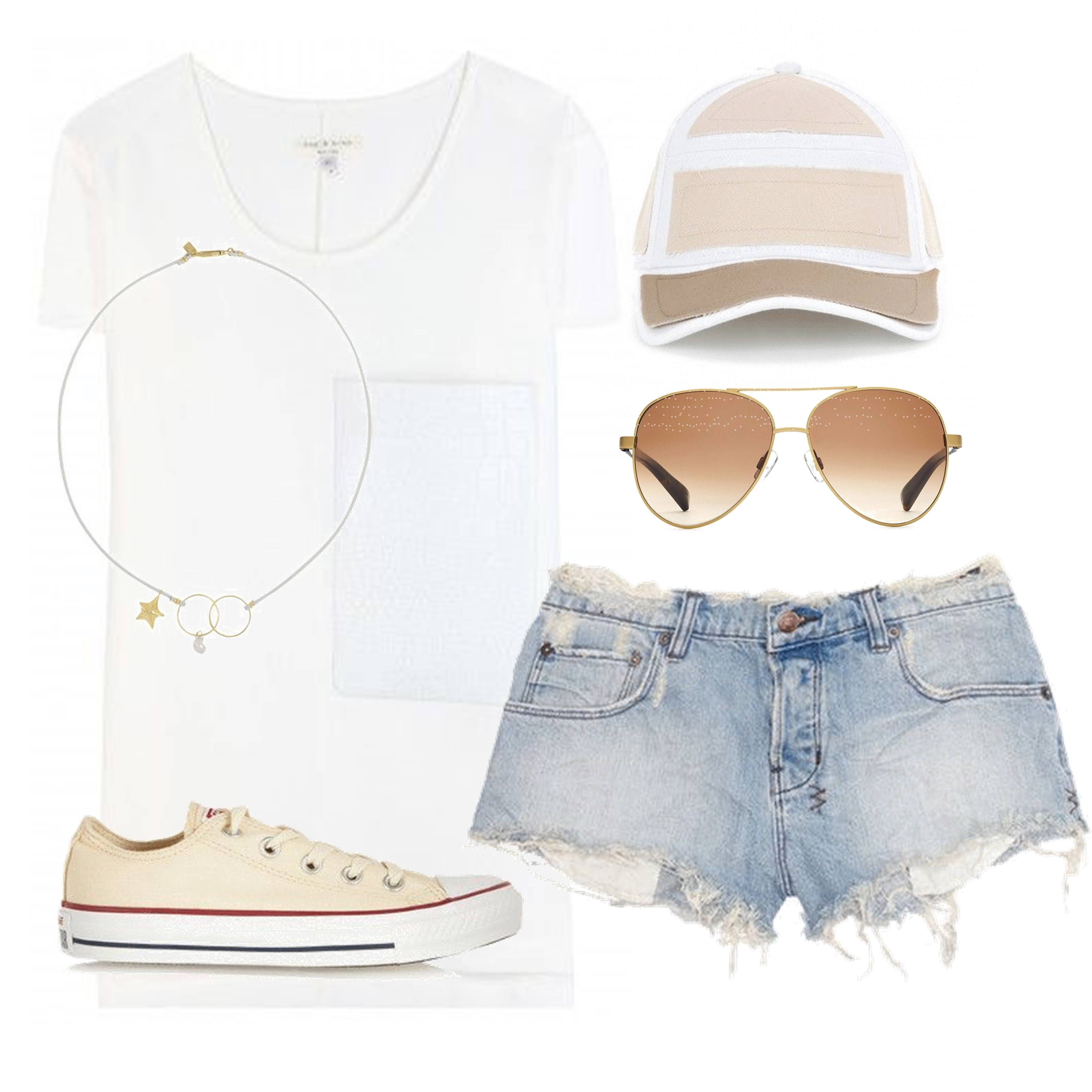 1. Rag & Bone basic T-Shirt | off white tee with a tonal embossed-leather pocket 2. Inez & Vinoodh necklace | gorgeous combination of gold, Tahitian pearl and white leather 3. Acne Studios clint patch twill baseball cap | for a sporty touch 4. Warby Parker Flannery sunnies | classic and polished 5. Ksubi’s distressed denim shorts | low on the waist with frayed trims 6. Converse Chuck Taylor All Star canvas sneakers | timelessly cool