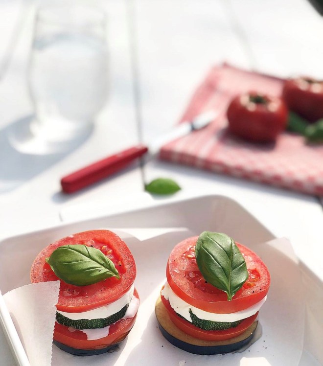 Verwarm de oven voor op 200 graden. Snijd de aubergines in plakjes, smeer ze rijkelijk in met olijfolie en leg ze op een bakplaat in de voorverwarmde oven. Intussen snijd je de mozzarella en tomaat in plakjes. Na twintig a dertig minuten oven, als de aubergines beetgaar zijn maak je er torentjes van met plakjes tomaat en mozzarella om vervolgens nog even vijf minuten terug de oven in te gaan. Garneer met basilicum, peper en zout en je kunt aan tafel!