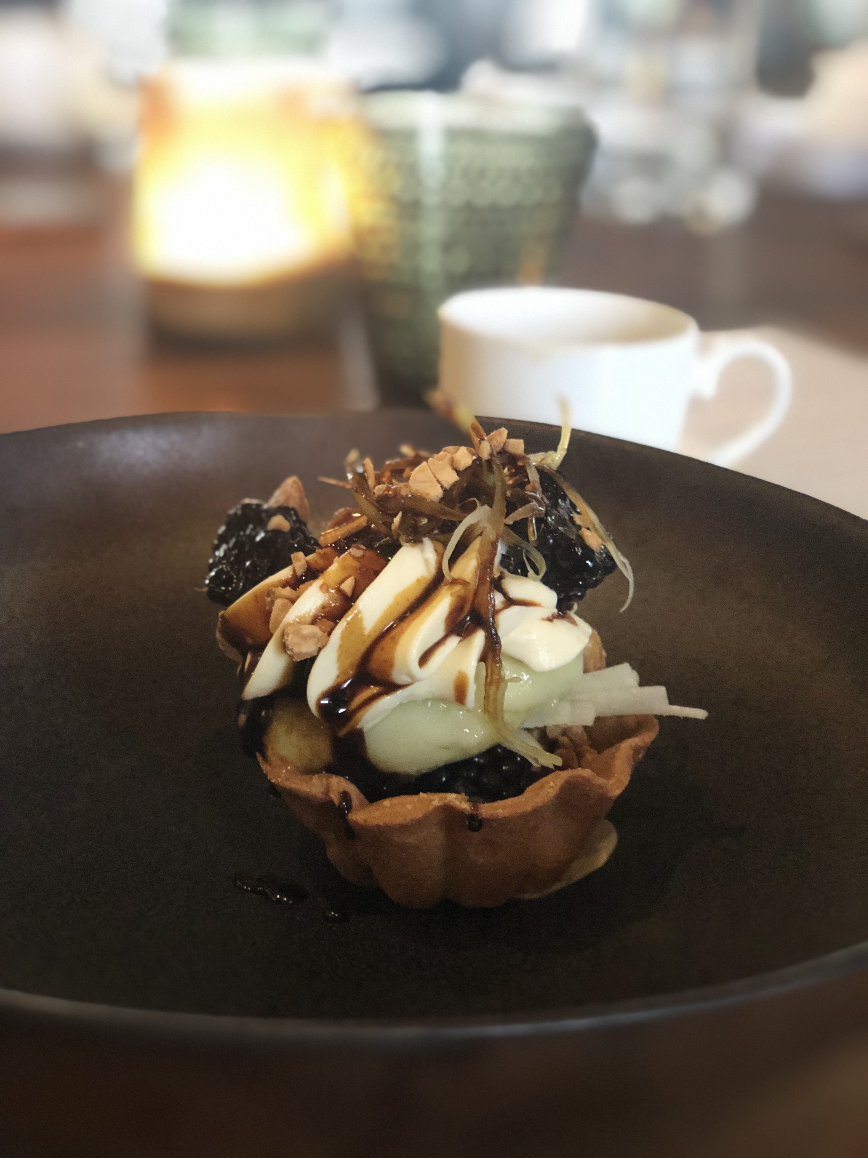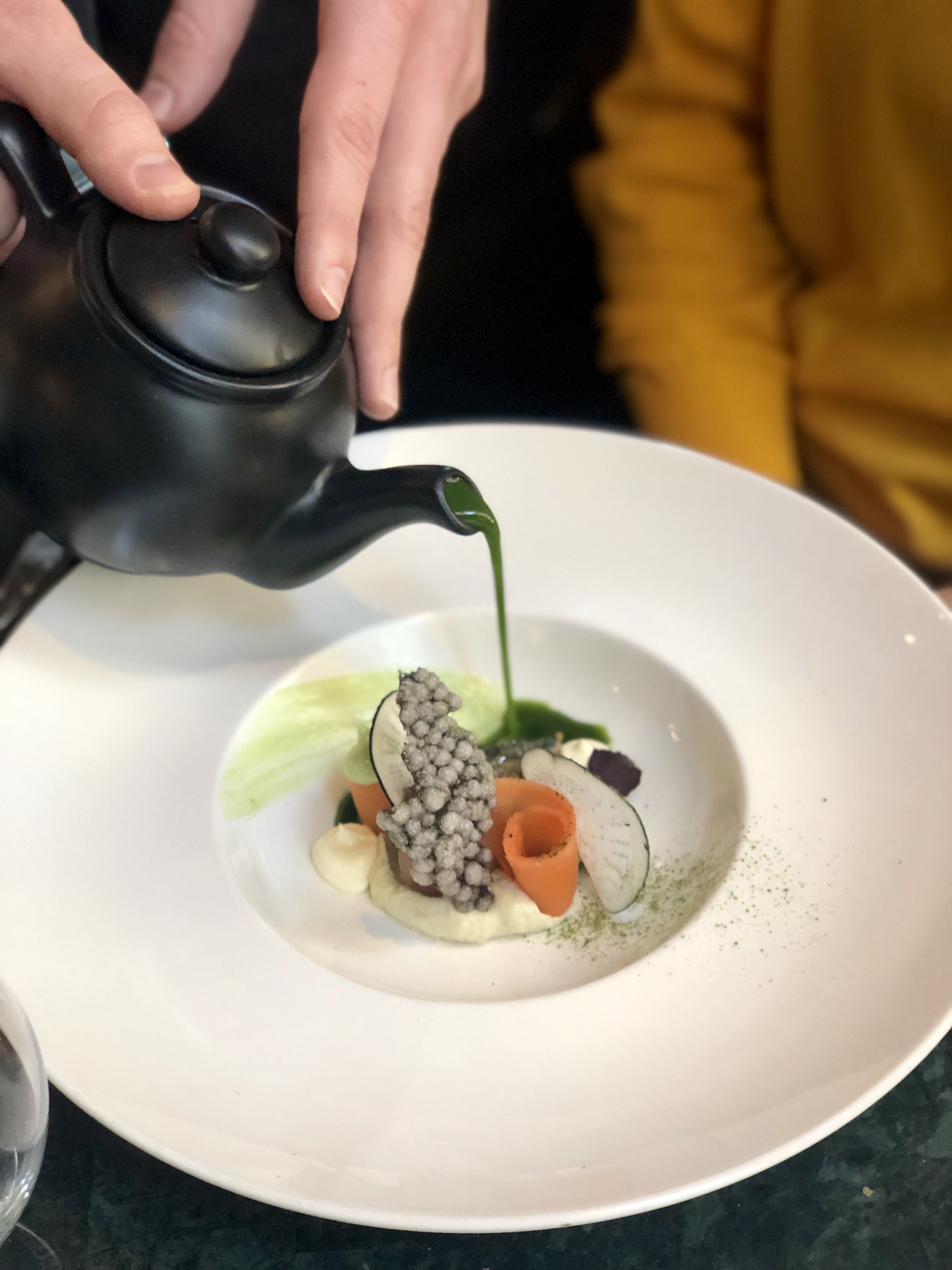 Noble Kitchen is het laatste adres zijn deze trip. Als je het mij vraagt een ´save the best for last´ programmering! Wat een indrukwekkend pand met dito interieur. Werkelijk al-les klopt hier. Ik kijk mijn ogen uit. De ligging met zicht op een golfbaan, de open keuken in het hart van het restaurant, de gedekte tafels…´Haast on-Nederlands!´, hoor ik mezelf tegen een Franse journalist zeggen.
