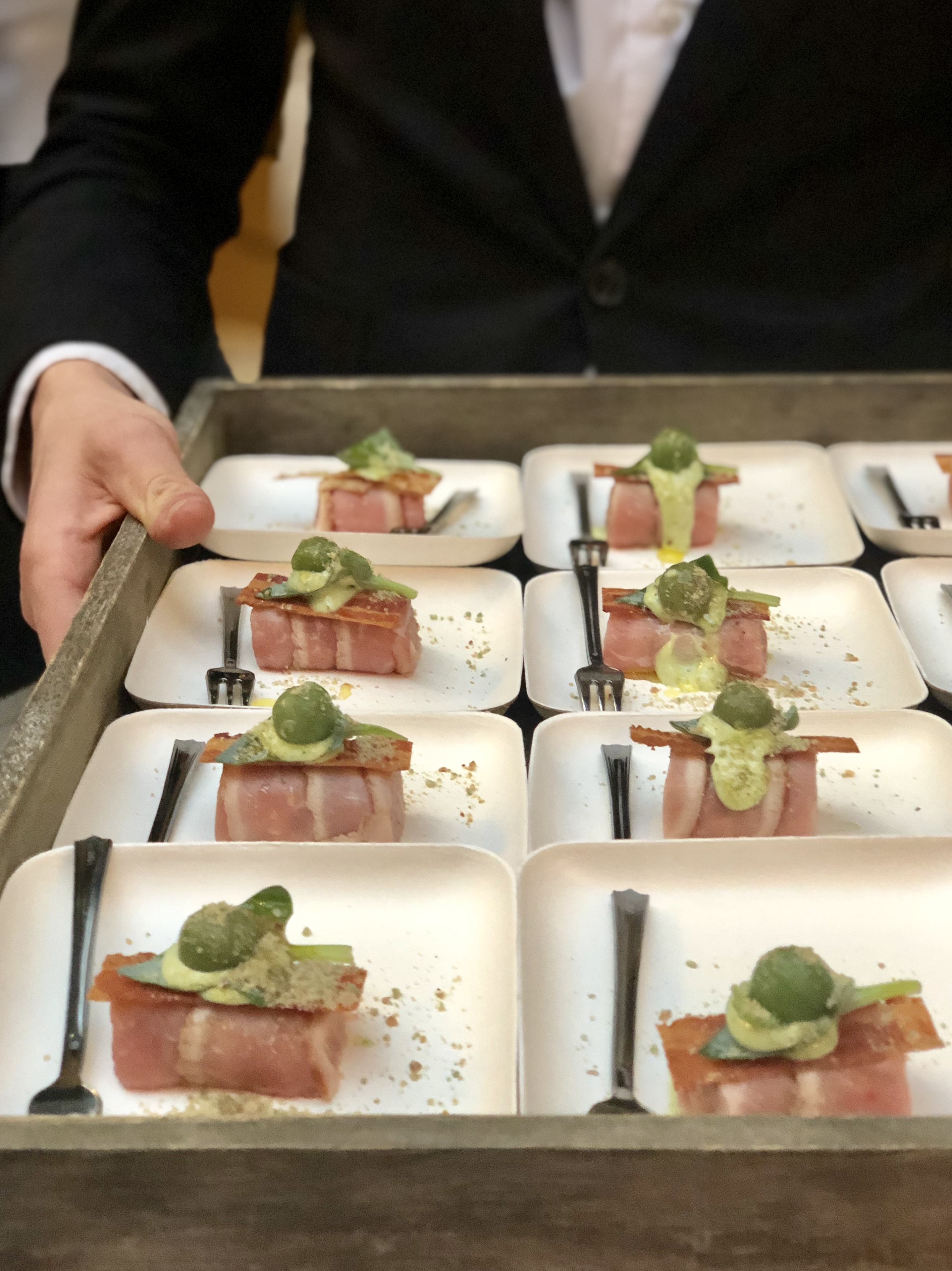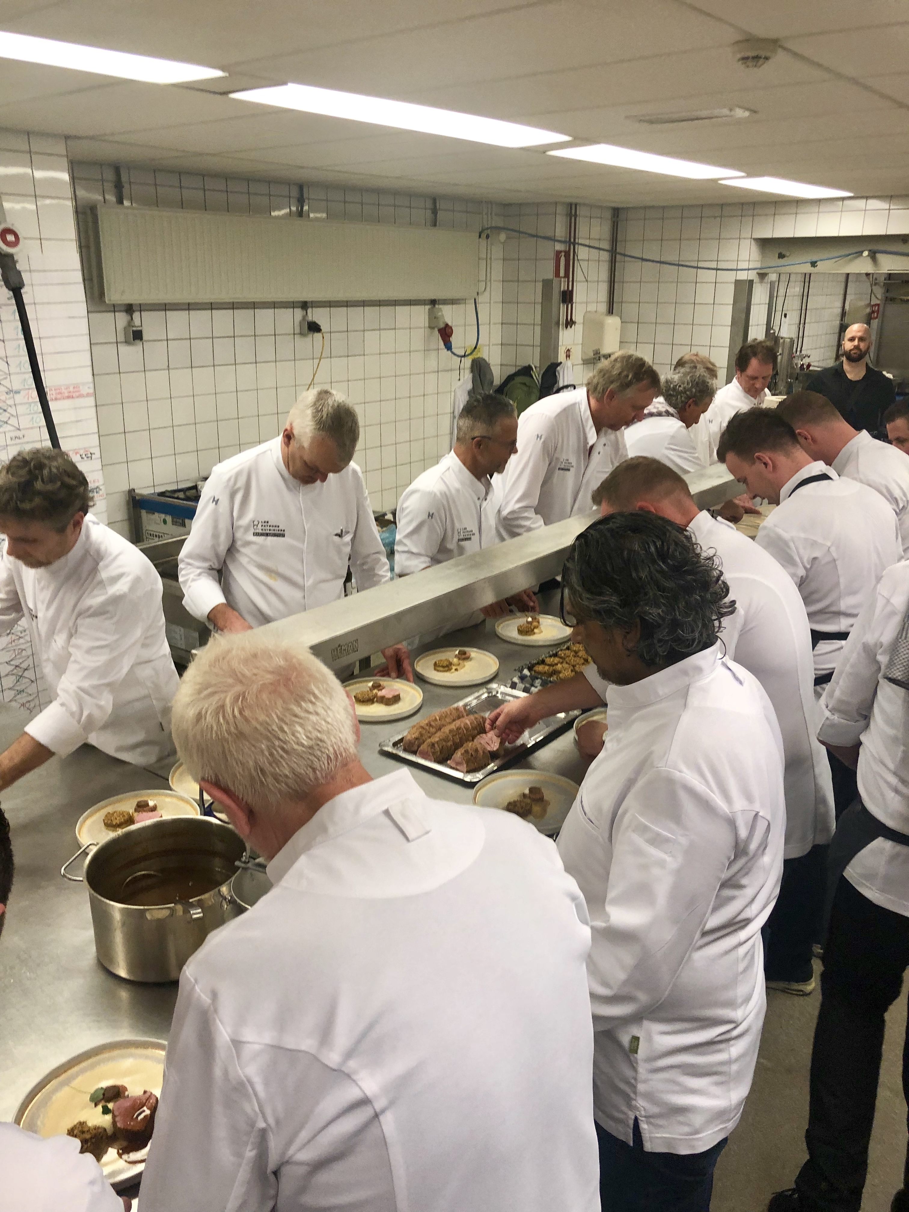 Aan weerzijden van de prachtige ruimte zijn de patrons druk bezig met het bereiden van de amuses. Vanavond eens niet weggestopt in de keuken maar te midden van alle gasten. Er wordt samen gelachen, gefotografeerd, technische vragen worden gesteld en mooie herinneringen opgehaald. Het enige wat deze topchefs vanavond onderscheidt zijn hun kraakheldere koksbuizen, die mooi afsteken tegen het overwegend zwart van hun gasten. Intussen ontstaan onder hun behendige handen de heerlijkste amuses…denk aan steak tartaar van kalf met een parel van vegetarische oester en wasabi (Karl van Baggem), een bavorois en gel van tomaat met olijf (Yuri Wiesen*) en eendenei met onderop salade van aardappel, espuma van aardappel en rundermerg, gekookte eendentong en kaviaar (Thijs Meliefste).