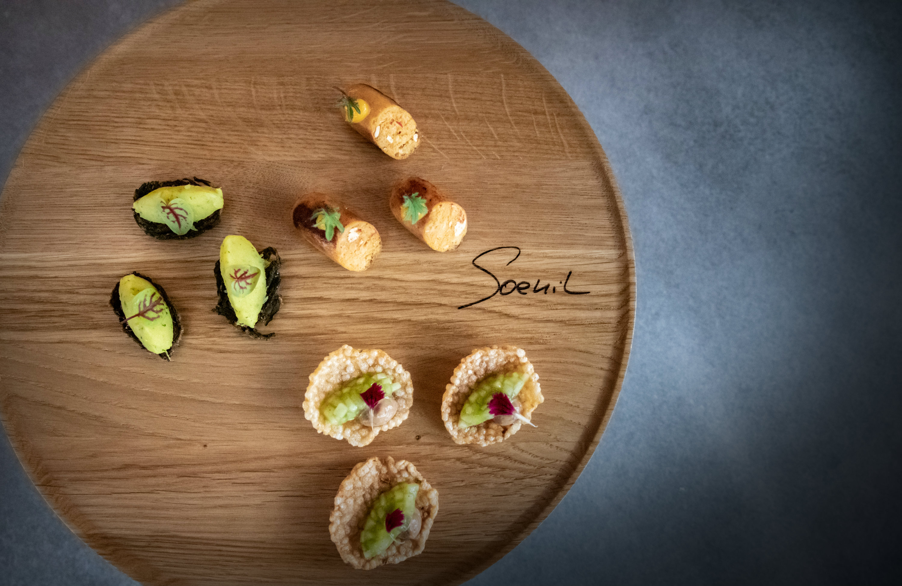 Op tafel wacht ons een kunstige tandoori krokant en daarbij een espuma van gegrilde paprika. Op een afzonderlijk plateau een krokantje gemaakt van nasi met daarop een chutney van komkommer en masala en een creme van Surinaamse pinda. Een brandade gemaakt van aardappel en kabeljauw van de bbq met daaronder Shina, een typisch Hindoestaanse snack. Daarbij een worstje van kip en kreeft met een creme van spicy mango en een brioche broodje van kerrie gevuld met kip curry…dit bedoelen ze dus met de unieke exotische smaaksignatuur van Soenil. Door de uitgesproken smaken van zijn herkomst, dacht ik terug aan onze mooie reizen en zelfs heel even aan een kortstondig exvriendje van lang, lang geleden….