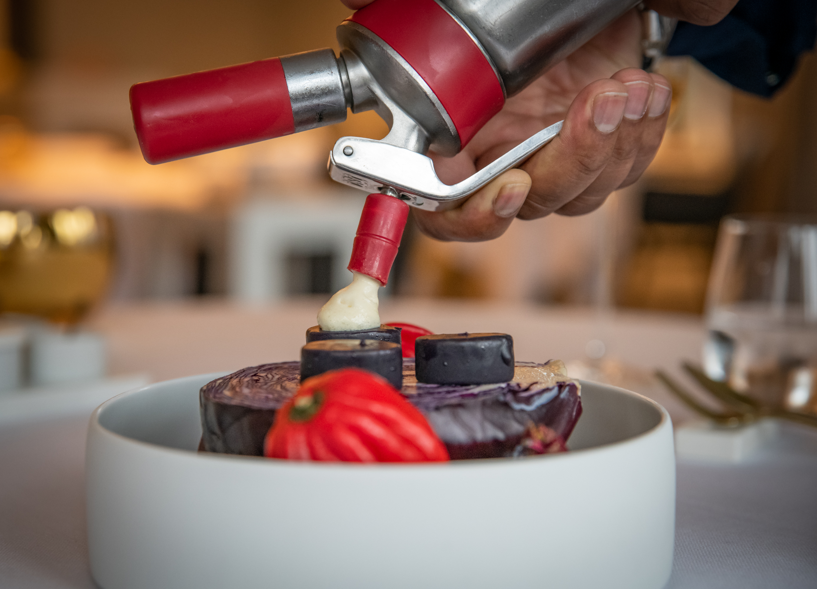 ´Deze bonbon neem je het best tussen duim en wijsvinger, niet te hard knijpen en dan in een keer in je mond´ En wat er dan gebeurt…dat zou je eigenlijk zelf moeten ervaren. Deze zinnenprikkelende bonbon, gevuld met een gazpacho van rode kool en daar bovenop een schuim gemaakt van mosterd maakt werkelijk alle zintuigen wakker. Voor mij het ultieme bewijs dat je met ingredienten daadwerkelijk iemand kunt verleiden.