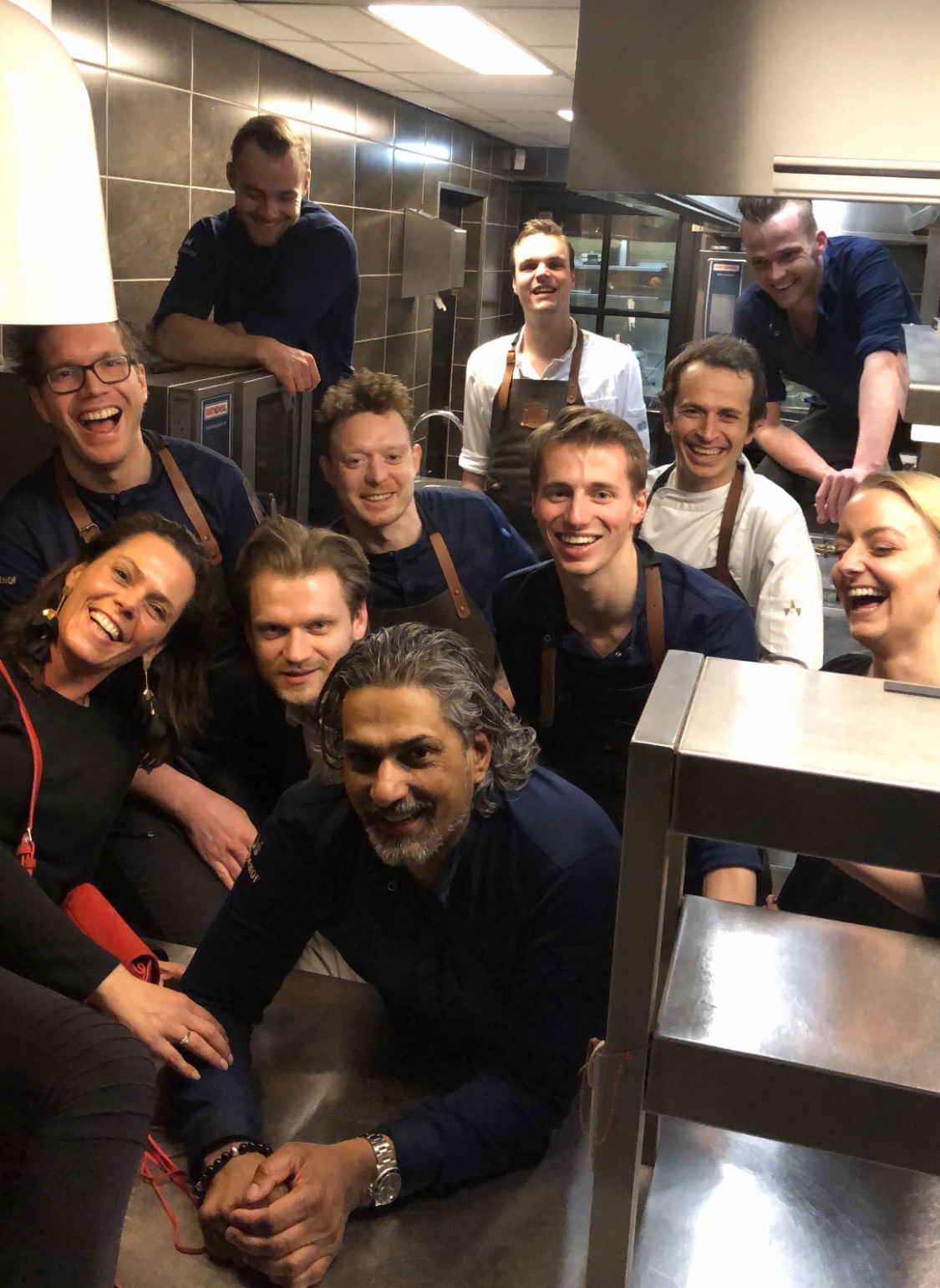 ´Kom, dan drinken we eerst een glaasje Champagne in de keuken´. Soenil schenkt twee royale glazen Bollinger in, terwijl hij vertelt over zijn inspiratie bronnen, het elke dag presteren op het allerhoogste niveau, het toch nóg beter willen worden…als ineens, zomaar tussen twee zinnen door een luide, dringende code klinkt. Het mag misschien lijken alsof hij volledig in ons gesprek zit, maar ontgaan doet Chef niets! De betekenis blijft voor ons een raadsel maar de voltallige keukenbrigade reageert in koor. Ik vermoed dat chef´s table klaar is voor het volgende gerecht maar persoonlijk had ik ´pas op wat je zegt, journalist in de keuken gesignaleerd!´ ook een leuke gevonden.