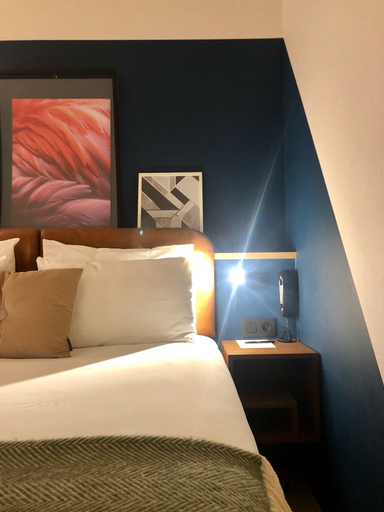 De kamer is zoals de receptie doet vermoeden helemaal in dezelfde warme sfeer met een fijn botanisch tintje. Op het bed ligt een persoonlijk briefje met Belgische pralines op me te wachten. Het zijn toch echt dit soort kleine dingen die het hem doen! Er staat een bureautje, een eigen koffiezet automaat en als ik naar buiten kijk zie ik de pracht en grandeur weer van het station. Vanavond, denk ik, vanavond na het diner kijk ik nog eens om het verlicht te zien.