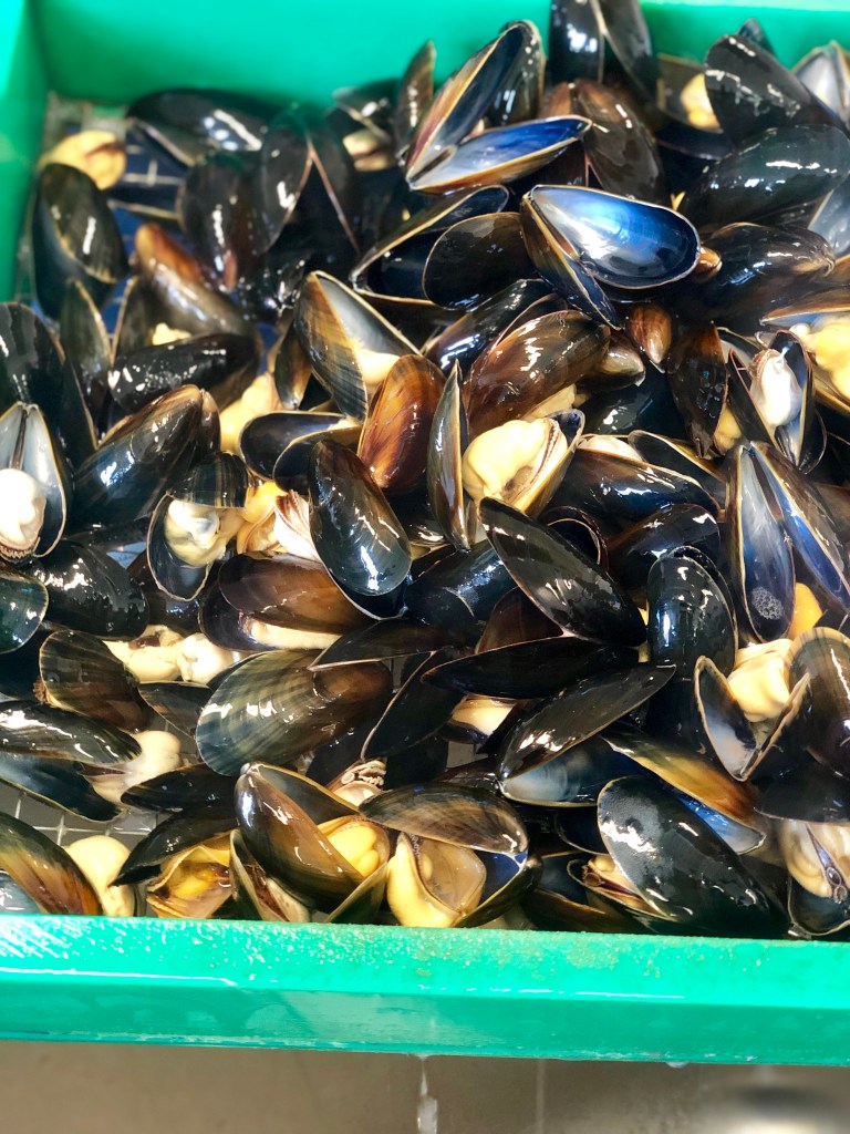 Als de mosselen zijn gekookt zien we verschillende kleurschakeringen verschijnen. ´Zijn die hele bleke ertussen wel goed?´, vraagt een bezorgde blogger naast mij. ´Daar is echt helemaal niets mis mee´, stelt de veilingmeester ons gerust. ´Mosselen zijn er, net als mensen in alle huidskleuren. Je voorkeur of referentie wordt vaak door je culturele achtergrond bepaald. Kom je uit Zuid Europa dan heb je je mosselen waarschijnlijk liever donker(oranje) van kleur´.