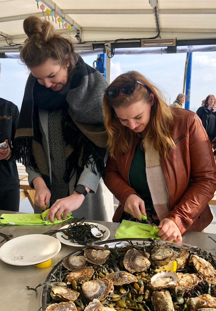 Zo´n perstrip is natuurlijk hard werken dus staan we niet veel later aan boord met een oestermes onze eigen tafeloesters open te maken. Een klusje van niks zo blijkt als Danny het ons heeft voorgedaan. En ik maar denken dat ik daar altijd mijn echtgenoot voor nodig had! ´Mooi´, zegt hij als ik hem het goede nieuws vertel. ´Volgende Kerst doe jij ze!´. Help…