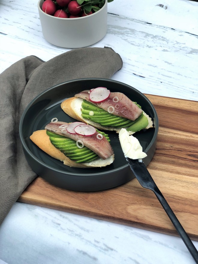 Rooster de sneetjes stokbrood kort in de oven. Besmeer ze alle acht met een rijkelijke laag roomkaas. Maak waaiertjes van halve avocado´s en leg deze op de roomkaas. Verwijder de staartjes van de haring, leg ze open en snijd ze in de lengte in twee. Leg op elk van de besmeerde sneetjes een halve haring en garneer met wat versgemalen peper, plakjes radijs en fijngesneden lente-ui.
