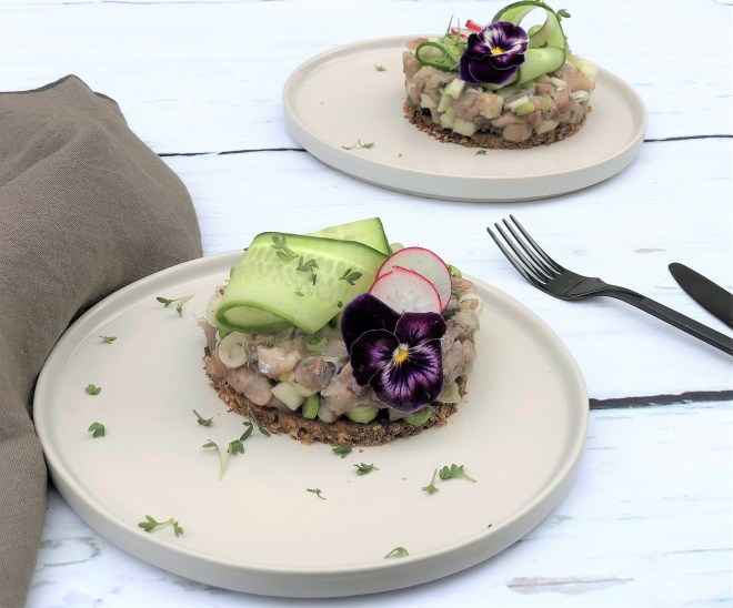 Verwijder de staartjes van de haring. Hak de vis in kleine stukjes en schep de fijngesneden bosui erdoorheen. Breng op smaak met versgemalen peper. Snijd de appel in kleine blokjes. Meng de appel met de gehakte haring. Steek met een ring mooie rondjes uit stevig roggebrood. Vul de ring daarna af met het haringmengsel en druk lichtjes aan. Verwijder nu de ring voorzichtig en garner met een komkommerkrul en verse tuinkers.