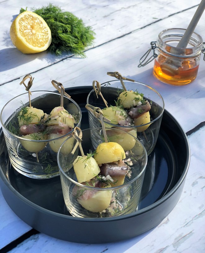 Krieltjes met koud stromend water afspoelen en in ca. 5 minuten beetgaar koken. Klop intussen de dressing. Meng in een kommetje de olie, honing en verse citroensap. Snipper een sjalotje fijn en roer deze samen met de fijngeknipte dille door de dressing. (Bewaar wat dille voor de garnering) Breng op smaak met wat zout en versgemalen peper. Giet de krieltjes af en schep deze door de dressing. Laat rustig afkoelen. Verwijder de staartjes van de haring en snijd elk in 6 stukjes. Halveer de krieltjes en prik eerst de bovenste helft, dan een stukje haring en als laatste de onderste helft op een prikkertje. Serveer in kleine glaasjes en knip er ter garnering nog wat extra verse dille over.