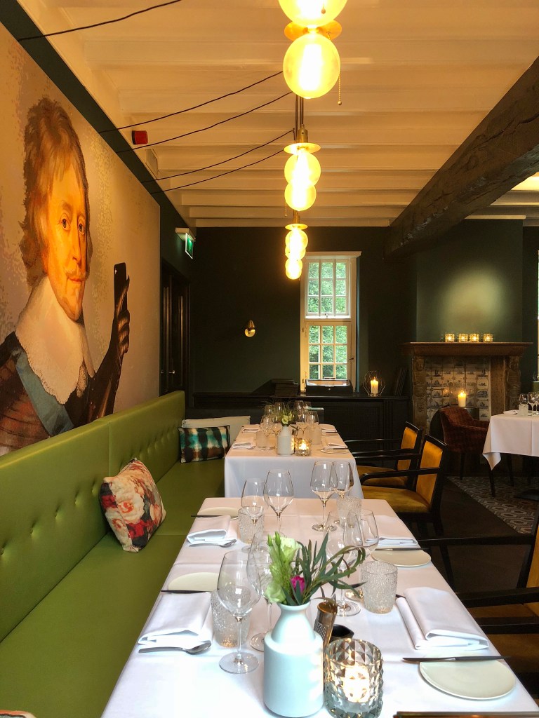 Eerst nog een hapje eten voor het slapen gaan? Niet ver van dit prachtige landgoed Huize Bergen ligt gewoon nog zo´n parel met allure! Via een ophaalbrug met kaarslicht loop je zo de binnenplaats op van Kasteel Maurick waar het sprookje verder gaat… Overal om ons heen branden sfeervolle vuurtjes en windlichten en ook de bomen zijn behangen met kleine lampjes. Als de deur van het restaurant vervolgens openslaat om ons warm welkom te heten dan weet je dat het een hele goede avond wordt…en dat werd het. Chef Niek serveerde ons in een minstens zo intiem restaurant onder andere 100% graan gevoerd rund uit Australie geserveerd met meiknol en verse truffel, een gerechtje van gerookte paling met knolselderij en groene appel, eentje met eend uit Helvoirt gecombineerd met foie gras, blauwe bessen en donkere chocola en als dessert – toetje zeggen wij hier in Brabant– wortelijs met salty caramel, vanilleroom en zwarte bes.