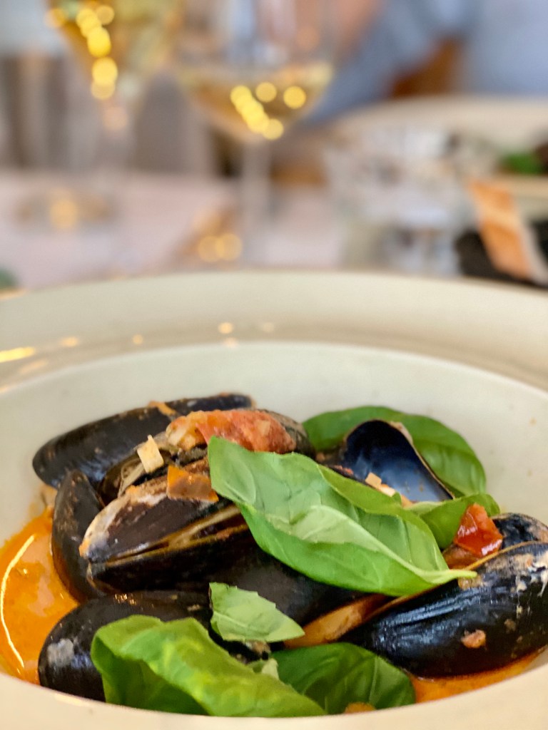 Oosterschelde paling, bodemcultuur mosselen, grijze garnaaltjes, kreeft (tuurlijk!) en verse coquilles passeren deze middag de revue. ´Op het bord rauwe coquilles met grijze garnaaltjes, aangemaakt met pomodori en basilicum. Daarbij een platte Zeeuwse oester met een vinaigrette gemaakt van manzanilla sherry…heel simpel´, licht hij het eerste gerechtje toe. Ook de in olijfolie met ui en knoflook gewokte bodemcultuurmosselen afgemaakt met tomaat, venkelzaad en pastis wordt als ´echt heel simpel´ geserveerd.