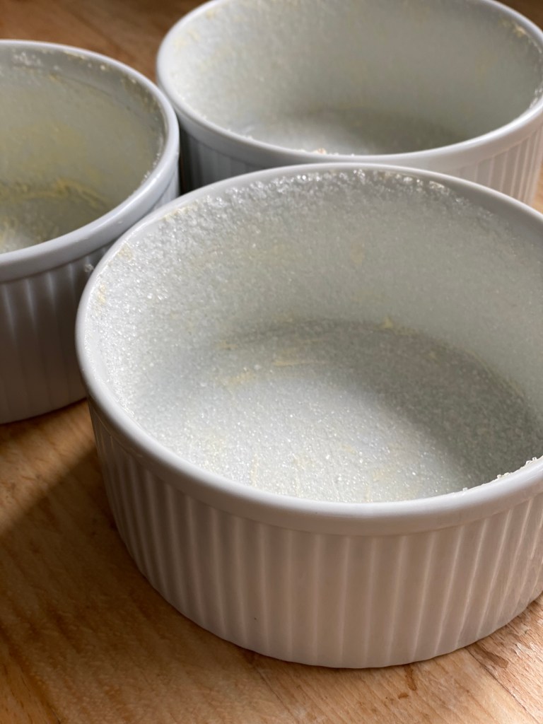 Bestrijk je souffléschaaltjes met boter (ik gebruikte twee ramekins met een diamater van 12 centimeter) en bestrooi die met kristalsuiker waardoor een dun laagje suiker ontstaat in het schaaltje.
