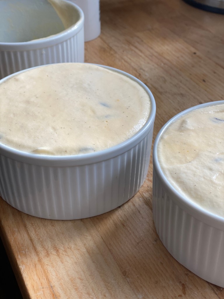 Meng het kwarkmengsel met het eiwit en vul de schaaltjes tot de rand. Strijk deze glad af met een paletmes of de achterkant van een gewoon mes.. Ga met de duim langs de rand van het schaaltje en wrijf dit randje schoon (waardoor de soufflé mooi egaal kan rijzen en niet vastplakt aan de rand).