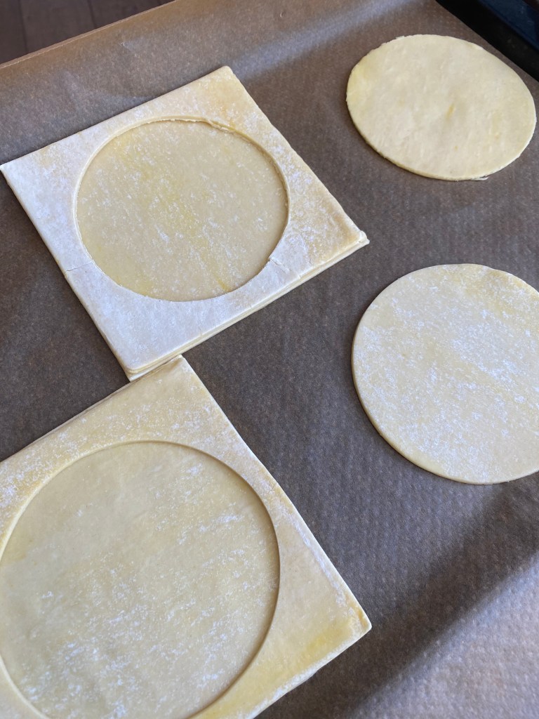 Neem twee plakjes bladerdeeg en snijd uit 1 plakje een rondje. Bewaar ook het uitgesneden rondje die je kunt gebruiken als deksel voor je pasteitje. Leg het plakje met het uitgesneden figuur bovenop het andere plakje bladerdeeg en schuif deze met het ´dekseltje´ernaast ongeveer 15 minuten laag in de oven. Je kunt natuurlijk ook voor kant en klare pasteitjes kiezen.