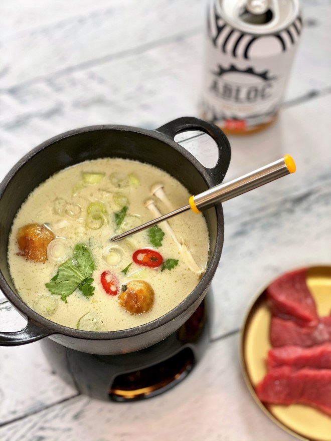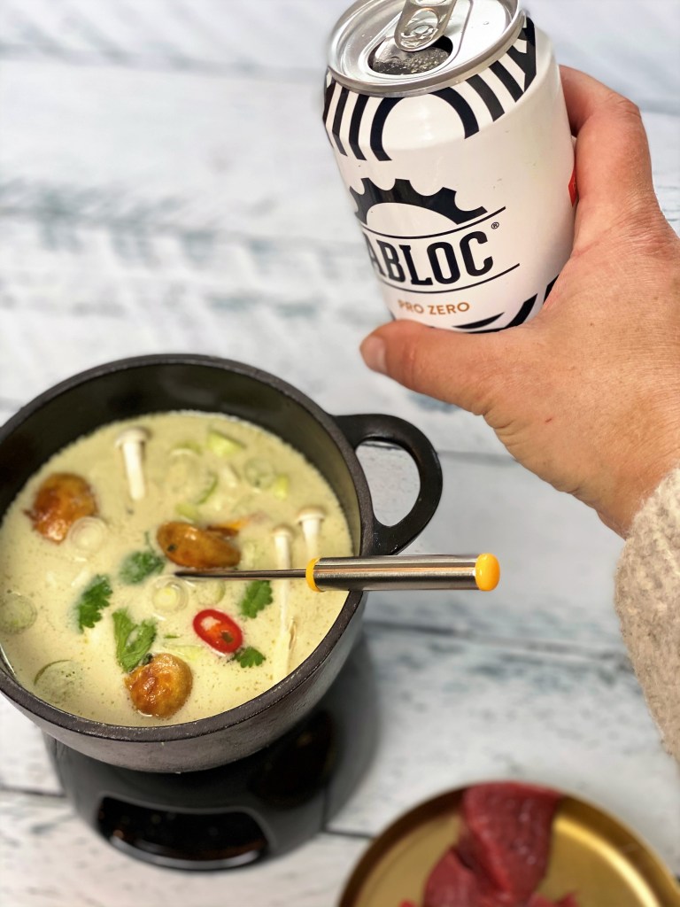 Vandaag gaan we het anders doen! Een fantastische pittige Thaise bouillon fondue met kokosmelk maakte ik net om deze pakjesavond ossenhaas en stukjes kippendijen in te garen, In plaats van de klassieke gourmet. Gezond, licht verteerbaar, ongelofelijk lekker en minstens zo gezellig.